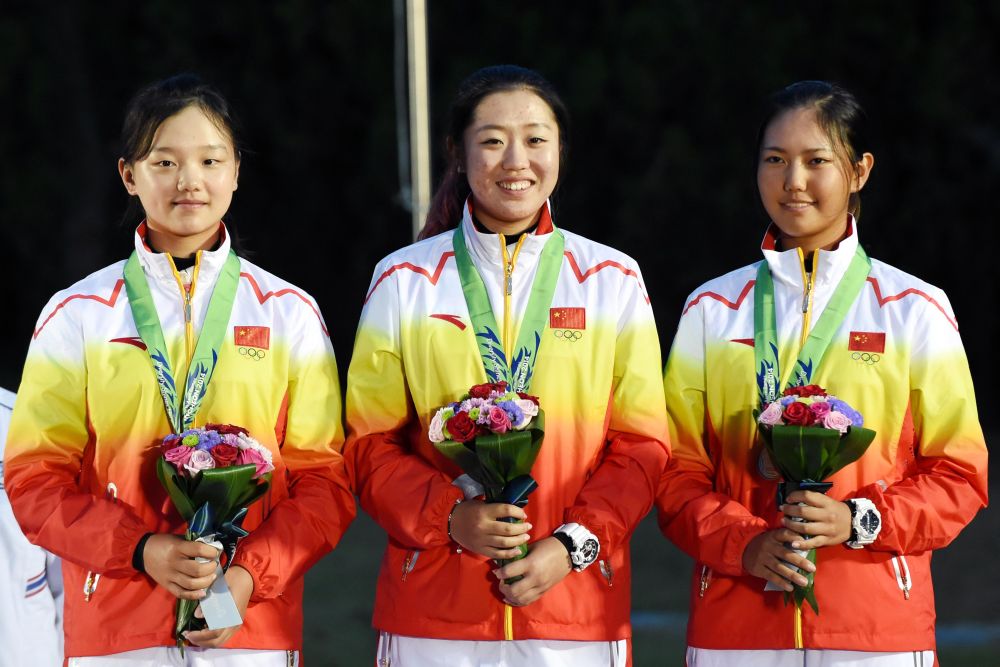 2014年9月28日,在2014仁川亚运会高尔夫球女子团体赛中,中国队以559杆的总成绩获得铜牌,中国队选手石昱婷、叶子琪与王馨迎(从左至右)在领奖台上。新华社记者 高健钧 摄