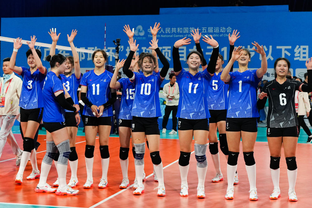 11月18日,在第十五届全国运动会排球女子18岁以下组冠亚军决赛中,江苏队球员获胜后向观众致意。新华社记者 陈思汗 摄