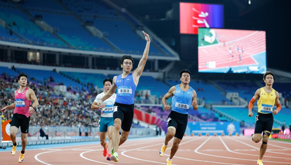 11月17日,第十五届全国运动会田径男子100米决赛在广州举行,湖北队选手李泽洋(左三)在冲线后庆祝夺冠。新华社记者 黄伟 摄