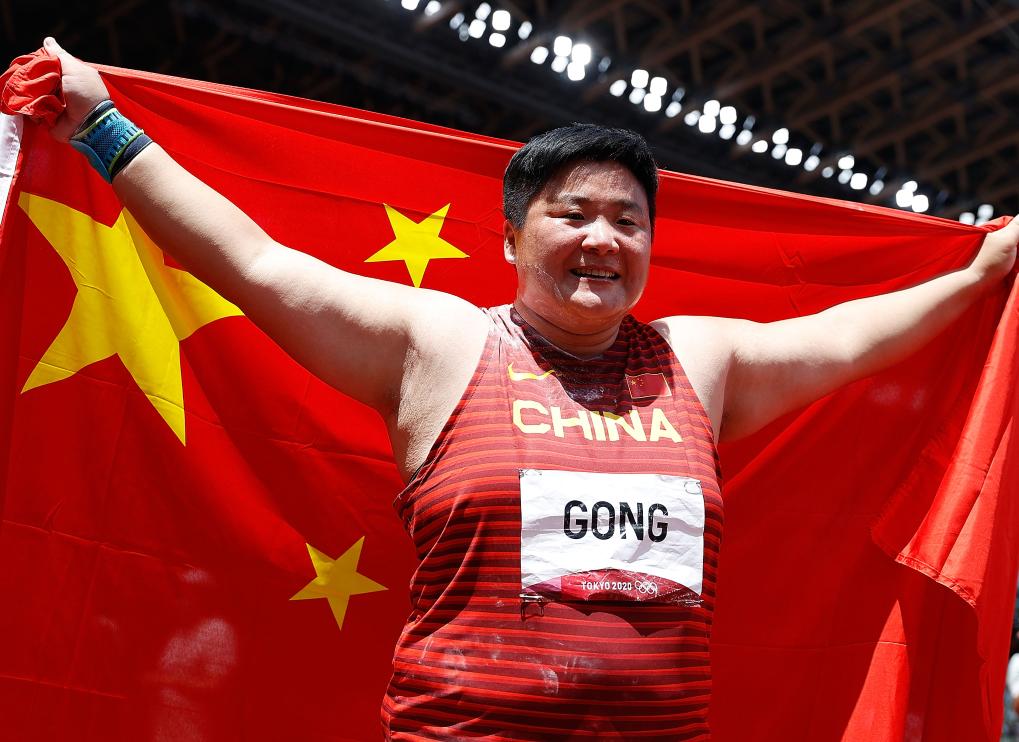 2021年8月1日,在东京奥运会田径女子铅球决赛中,中国选手巩立姣夺得冠军。新华社记者 王丽莉 摄