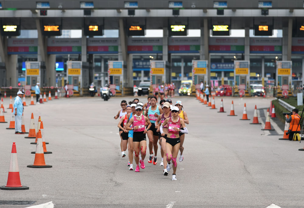 11月15日,全运会田径项目女子马拉松比赛参赛选手经过深圳湾口岸。新华社记者 毛思倩 摄