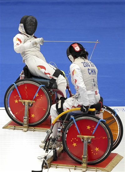 12月9日,在香港举行的全国第十二届残疾人运动会暨第九届特殊奥林匹克运动会轮椅击剑项目女子个人花剑A级金牌赛中,上海队选手辜海燕战胜上海队选手邹绪凤,夺得冠军。图为辜海燕(左)和邹绪凤在比赛中。新华社记者 侯俊摄