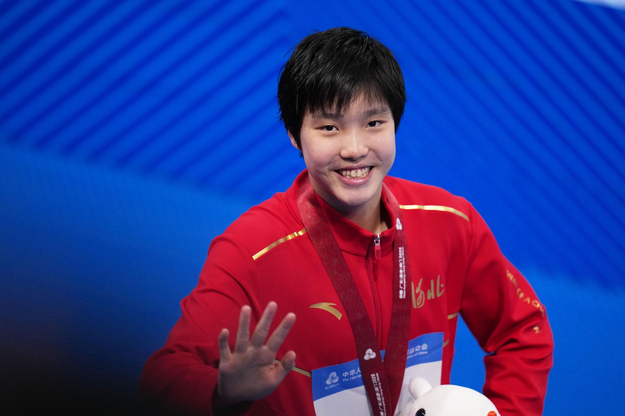2025年11月,于子迪在十五运会女子400米个人混合泳决赛中夺冠。这是她在颁奖典礼上。图片来源:新华社