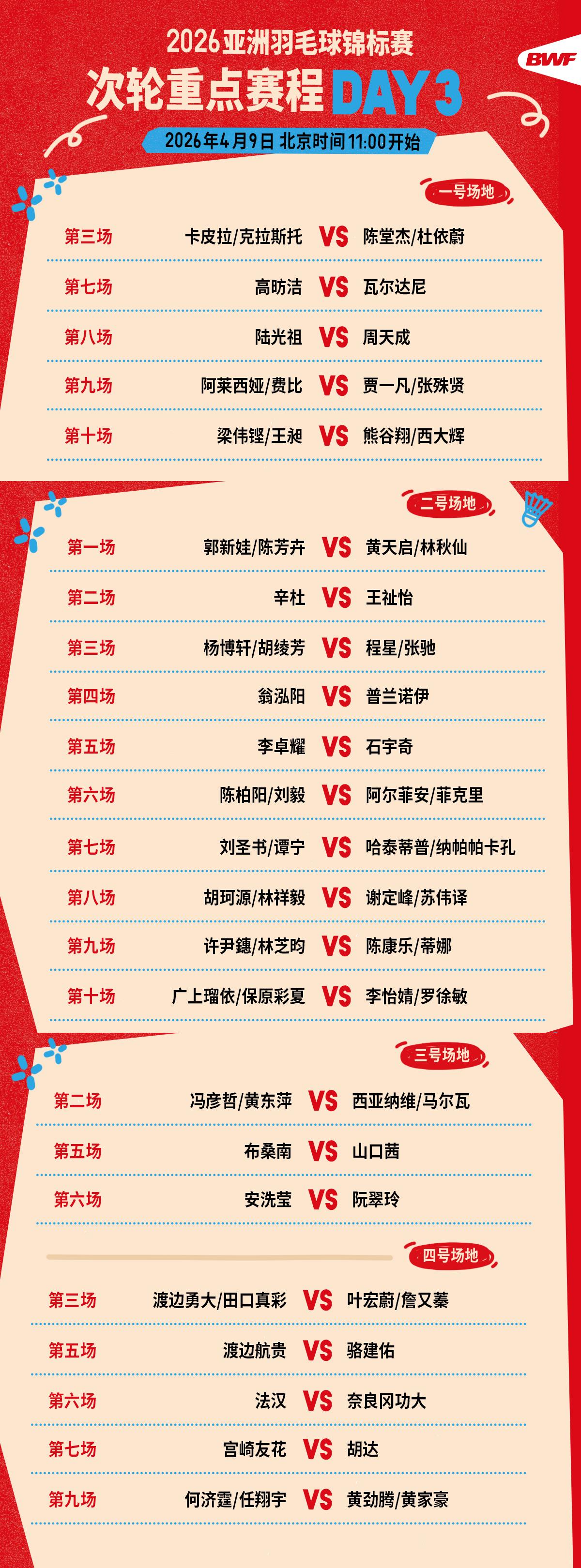 2026年亚洲羽毛球锦标赛今天(4月9日)迎来第三个比赛日,将于北京时间中午11时开赛。