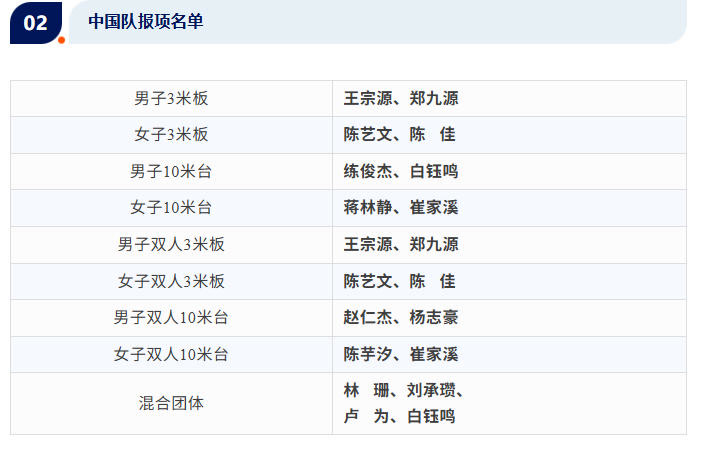 女子方面,3米跳板的单人和双人比赛由陈艺文、陈佳参加;10米跳台比赛,蒋林静、崔家溪参加单人项目比拼,双人项目则由陈芋汐搭档崔家溪。